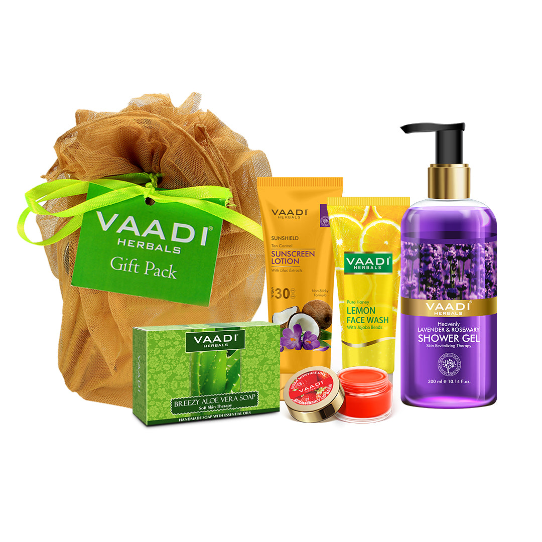 This gift box has complete skin care products such as lemon face wash, shower gel, strawberry lip balm, sunscreen lotion spf 30 and aloe vera soap. I used this set twice a week as per the Vaadi consultant and I am happy with the products.