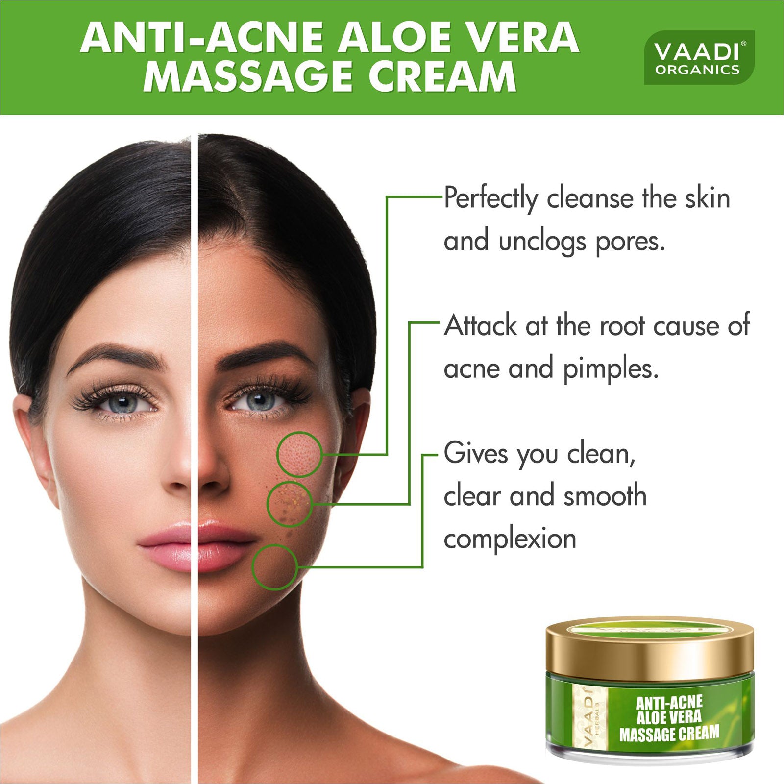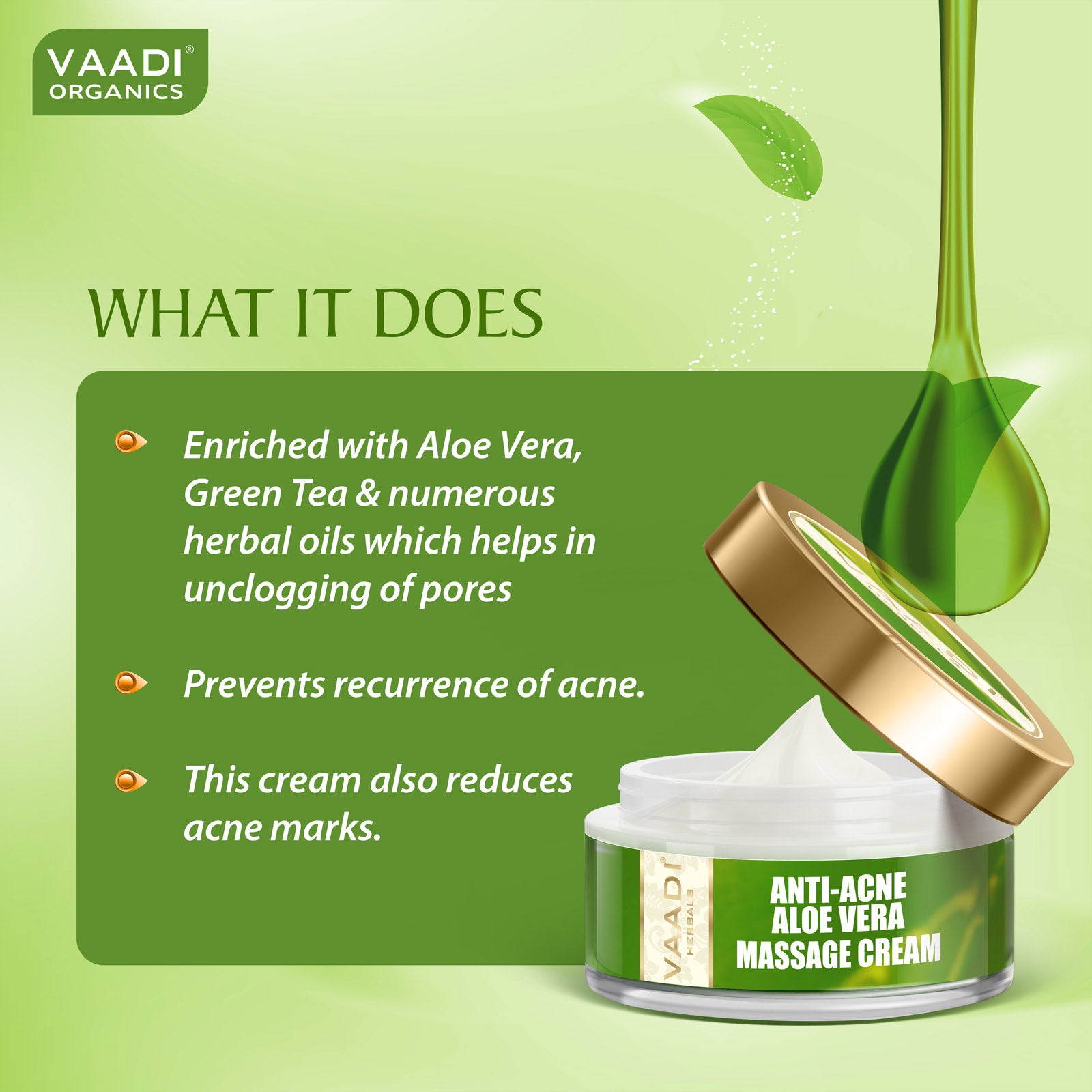 Vaadi Herbals Anti Acne Aloe Vera Massage Cream is very good for acne prone skin. After using for days it solve my problem. it?s remove my dark spot on my face. and feel like natural greenery & Feel very fresh after use this Aloe Vera massage cream.. Thanks Vaadi.