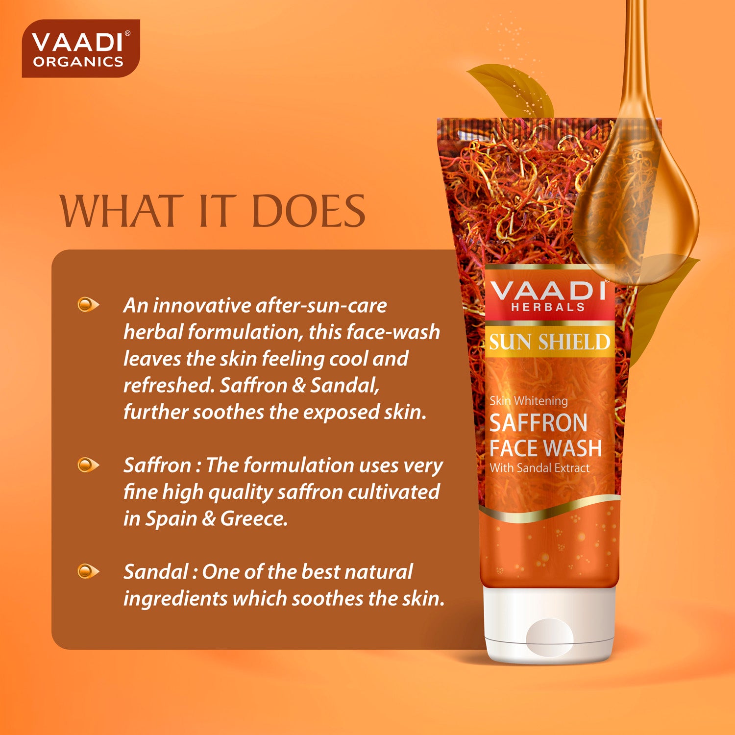 It has one skin whitening saffron face wash, an innovative after-sun-care herbal formulation which fights and reverses the UV damage to the skin, while leaving it feeling cool and refreshed. Anti-oxidants, Saffron and Sandal, further soothe the exposed skin, as well as miraculously fade away sun-tan and pigmentation, granting you a fairer and smoother complexion.
