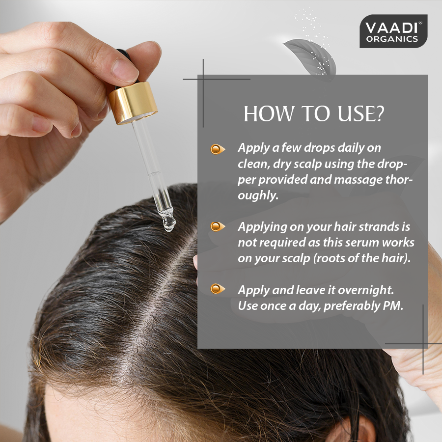 Apply a few drops daily on clean, dry scalp using the dropper provided and massage thoroughly. Applying on your hair strands is not required as this serum works on your scalp (roots of the hair). Apply and leave it overnight. Use once a day, preferably PM.