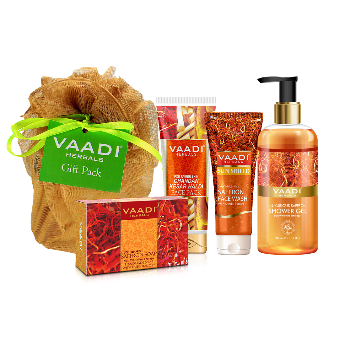 This Skin Whitening set is excellent for visibly improving the texture and complexion of the skin using the age old benefits of Luxurious Saffron. The gentle face wash and face pack ensure that the facial skin absorbs all the nutrients to give a healthy and natural glow. This set also comprises of the saffron Soap and Shower Gel that pamper the body daily and make the skin luminous.