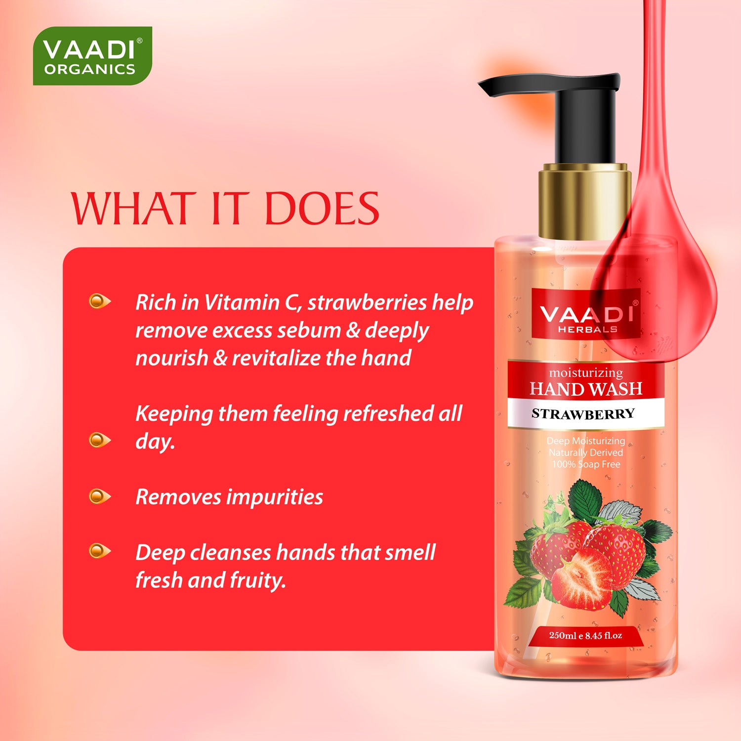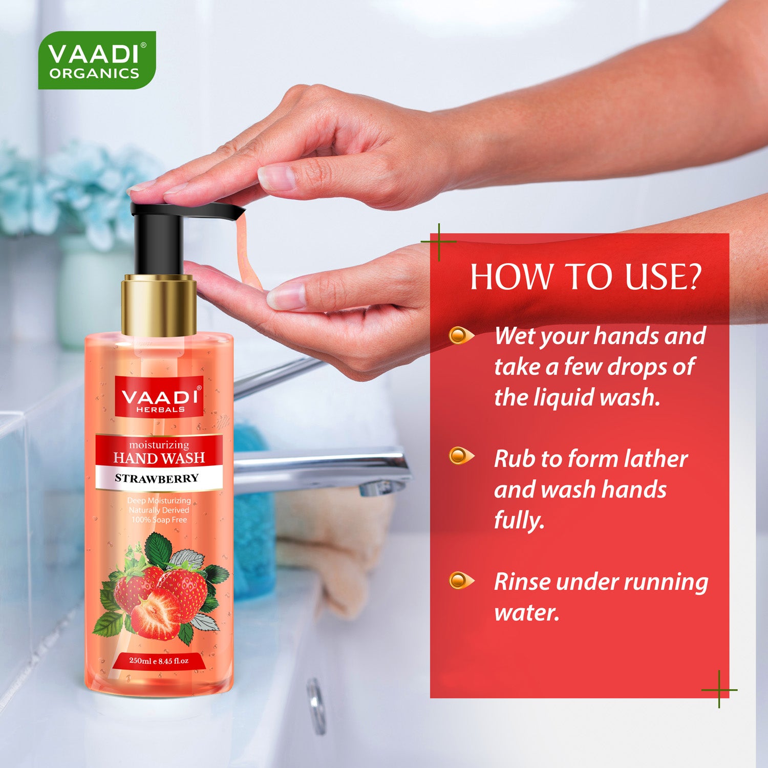 Strawberry hand wash is an effective cleanser that leaves your skin feeling fresh, healthy and clean. The gentle frangrance leaves behind a trail of freshness and calms senses. This hand wash helps maintain the natural moisture balance in skin and the hands feel beautifully soft and conditioned.