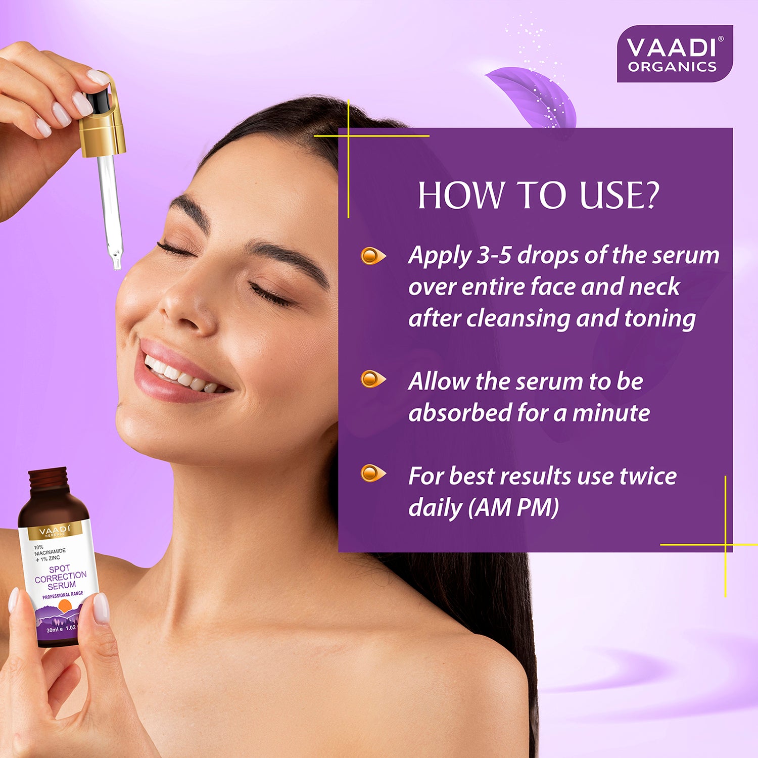 Apply 3-5 drops of the serum over entire face and neck after cleansing and toning. Allow the serum to be absorbed for a minute. Follow with an oil free moisturizer. For best results use twice daily (AM PM).