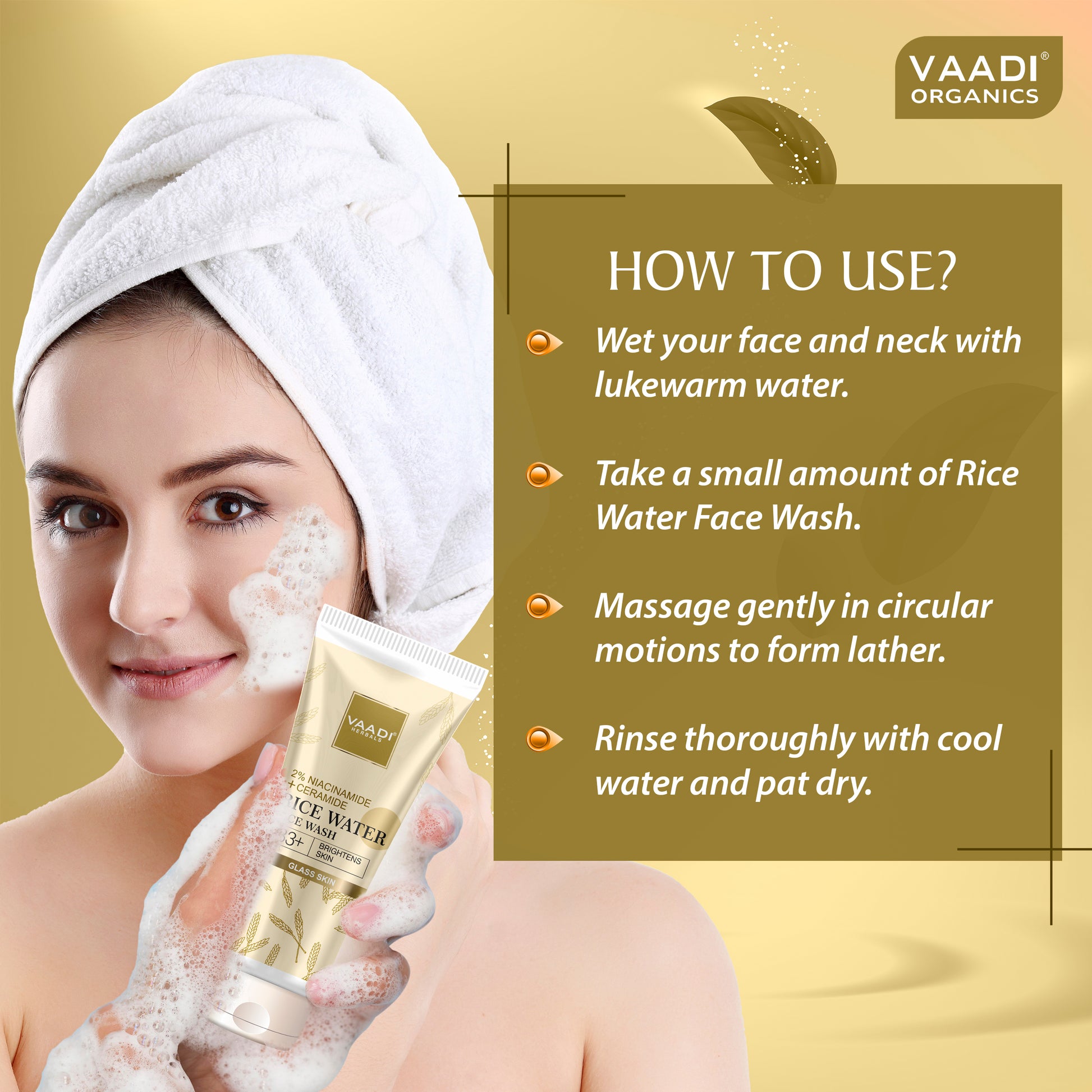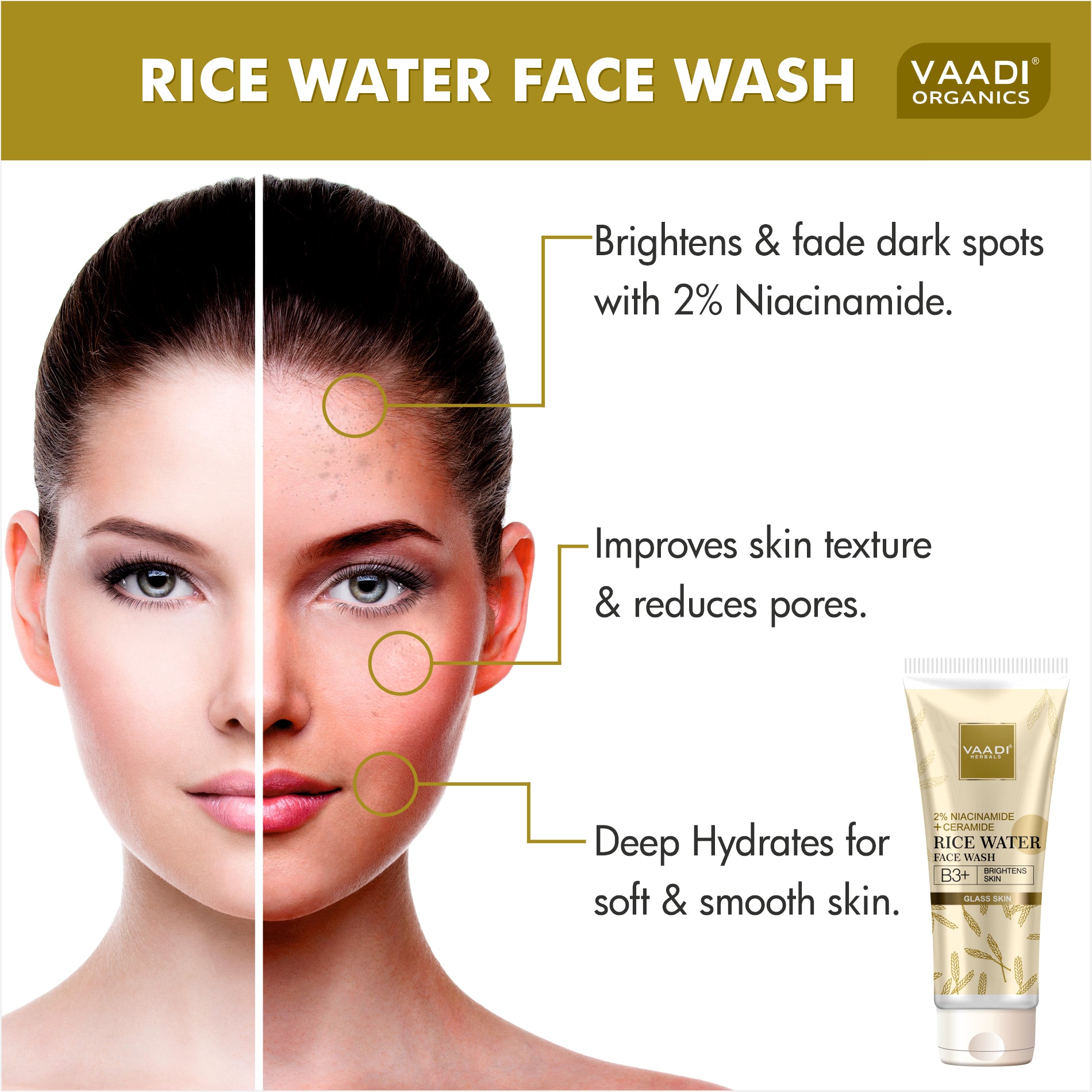 Vaadi Herbals 2% Niacinamide + Ceramide Rice Water Face Wash | B3+ | Brightens Skin|Glass Skin Look| Hydrating (60 ml)